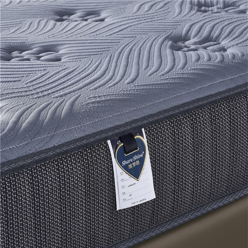 Nuestro colchón híbrido de resortes y espuma de alta densidad de alta calidad presenta elegantes etiquetas en las esquinas que realzan el producto. reconocimiento y sentido de calidad, especialmente importante para habitaciones de hotel de marca y exhibiciones de salas de exposición.